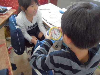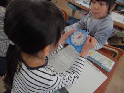 時こくや時間を学習しました。「1時間は60分」「1日は24時間」ということを知り,「1日って長いな。」や「学校には,7時間くらいいるんだね。」など,時間について考えることができました。