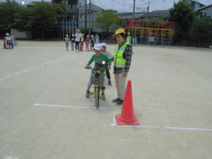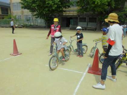 実際に自転車にのって練習をします。自転車の乗り方や止まり方など,自転車に乗りながら確認をします。