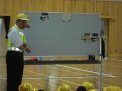 約束を知った後は,実技です。体育館に引いたラインを道路にして道を横断する練習をしました。地域の方に見守られながら,上手に渡ることができました。