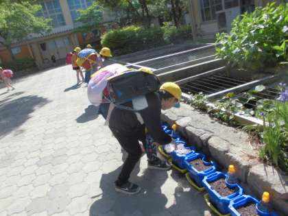 「これくらいの深さでいいのかな?」「いつ花がさくのかな?」と,わくわくしながら種まきをしました。