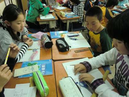 写真は、算数の「対称な図形」の学習の様子です。