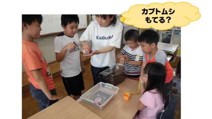 すると,月曜日。1年生が「足が見えるよ!」と大発見。3匹のうち2匹が成虫になって出てきていました。