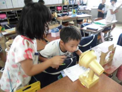 27日(火)2時間目に夏休みの作品を観賞しました。身近な物を使って,いろいろな作品ができていて,どの作品も工夫されていました。夏をテーマにしたものも多くあり,色合いも鮮やかで素敵な作品が多かったです。