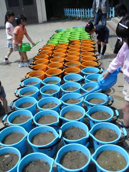 今日は、これからぐんぐん芽がのびてくるよう、気持ちをこめて水を入れました。