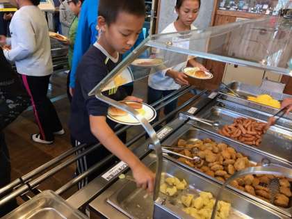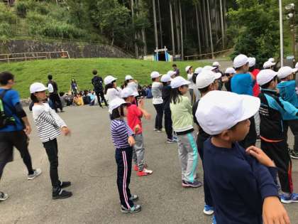 2日目の朝、曇り空の下で「おはようダンス」をしました。朝食のバイキングでは、パンにご飯にとたくさんいただき、外を見ると雨。心地よい風と雨音を聞きながら、少しリフレッシュし、今から今日の活動に入ります!
