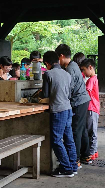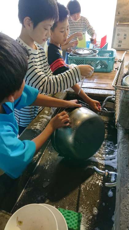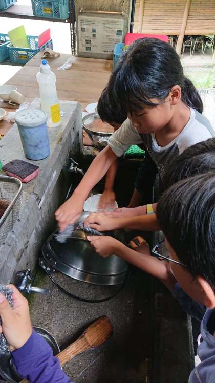 二回目の野外炊事が終わりました。昨日の活動では,鍋の油汚れや鍋についたすすを落とし切ることができませんでした。今日は,昨日の経験を生かし,汚れがついているところを重点的に磨きました。グループの仲間と交代しながら,磨くことで,使う前と同じくらいにきれいにしました。