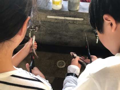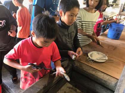 いざ、さばきに入ると「え、どうしよう。」と真剣な表情に変わり始めました。まだ,ピクピクと動く魚をさばき、頂くという命の学習です。