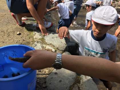 「魚つかみ?やったー!」と、冷たい水に足から入り、2人とも上手に捕まえることができました。さばきでは、ぐいぐいハサミを入れ、内臓をキレイに洗うこともできました。(ちょっと怖がる場面もありましたが)