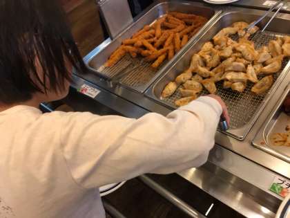 お風呂に入り、さっぱりした後は楽しみなバイキングへ。今日はどれを食べようかなぁ?とワクワクしています。今日はもものゼリーが付いていたので、大喜びでした。