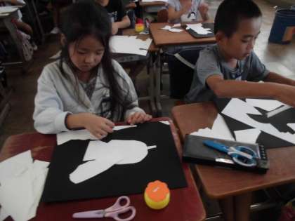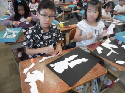 はさみで形にこだわらずにどんどん切っていきます。切り取ったものを黒の画用紙の上に気に入るように並べていくと,何かの形に見えてきて・・・。