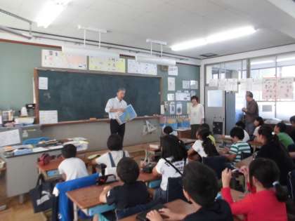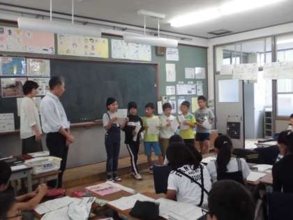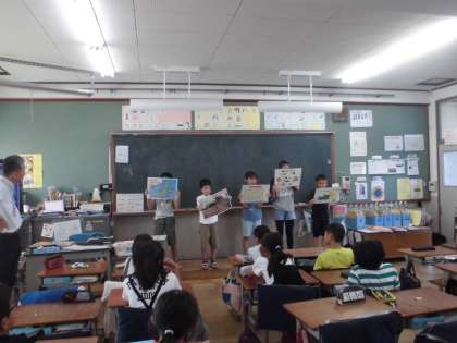 4年生は夏休み前から総合的な学習で地球環境問題を解決するためのエコライフチャレンジに取り組んできました。今日は夏休みに取り組んだエコ活動をふり返るため,気候ネットワークの方々にお世話になり,振り返り活動をしました。