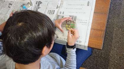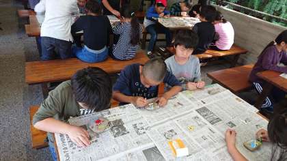 思い思い、自分のみさきの家での思い出やみさきの自然、キャンプファイヤー、みさきにいる生き物などを盛り絵の具で表現しました。