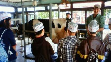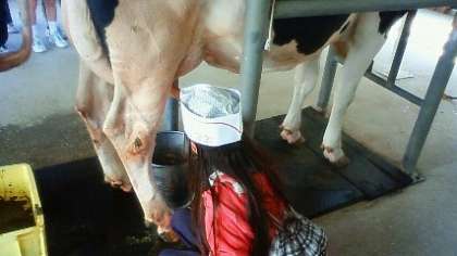 大きな牛にそっと手をのばして乳搾り体験をしますが,なんかこわごわしている感じです。大きな乳首をつかむと温かいのでちょっとびっくりする一方で,MILKって牛のお乳なんだと再認識するときでもあります。