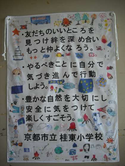 みさきの家の旗が出来上がりました。77人で話し合った活動の目あてを確かめ,一人一人が絵を描きました。77人の心がひとつになった,ワクワク・ドキドキの旗です。