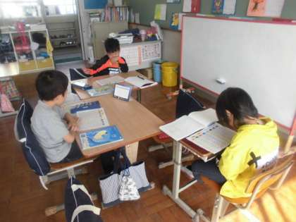 3時間目,さくら教室では算数の時間に九九のテストをしました。「今日は4のだんを頑張る!」「7のだん,いけるかな?」と自分のペースでテストに挑戦し,合格すると「やったー!よし次!」と意欲をもって取り組んでいます。また5組では牛乳パックを使ってはがき作りに挑戦しています。細かくした牛乳パックをミキサーにかけ,完成するまでの工程を自分で行います。紙の量や形が少しゆがんでも,それがいい味となりすてきなはがきが次々に完成しています。