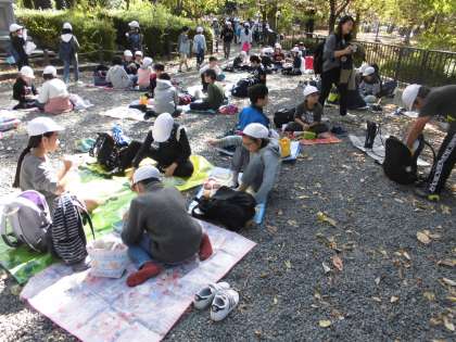 お弁当は,田辺朔郎の銅像の前で食べました。お昼には少し早かったのですが,みんなおなかが減っていたようで,喜んで食べていました。外で食べるお弁当は特別おいしかったようです。