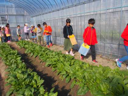 今日までどんな土で育てているのかな,どうやって収穫しているのかな,などといろいろ予想していたので,実際に水菜や白菜の収穫している高校生のお兄さん,お姉さんの姿を見ることができて大変嬉しかったようです。また,写真で見た伝統野菜「すぐき」「金時にんじん」を見つけては喜んでいました。