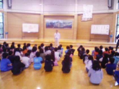 これからお世話になる「みさきの家」の所長さんのお話をしっかり聞き,挨拶をします。学校で協力して作った4年生の旗を掲揚しました。