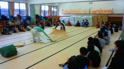 みさきの家の所員の方に布団の敷き方や、寝袋の使い方を教えてもらいました。上手に敷けるかな?