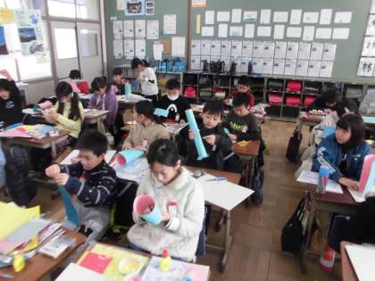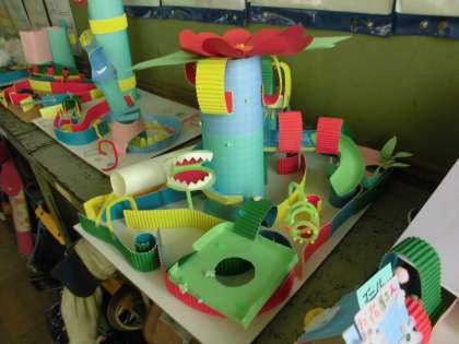 図画工作科では立体作品「コロコロガーレ」を作成中です。自分の作りたいテーマに合わせて,画用紙の色や形,高さを工夫してビー玉が通れるコースを作成しています。