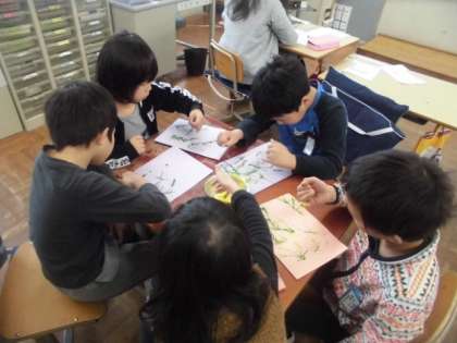 いよいよ今年度最後のカレンダー作りをしました。「3月と言えば?」「ん〜、お雛様!」「春!」「春休み!」「桜!」とたくさんイメージが出てきました。その中で黄色い花のイラストがあり,「これ何?」「これは菜の花だよ。春に咲くお花。」となり,カレンダーに菜の花を描くことになりました。緑の絵具を紙に落とし,ストローで吹くと,まるで枝のようになる技法を楽しみ,そこに黄色の絵具を指先につけては花びらを描いていきました。空いているスペースにはお雛様を作ったり,詩をつけたりと,思い思いの飾りをつけてすてきなカレンダーが完成しました。