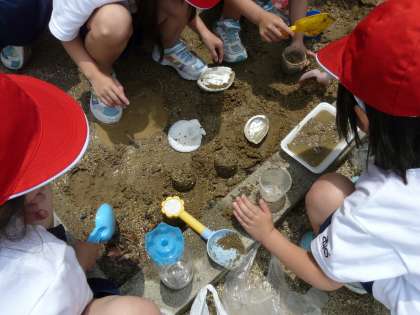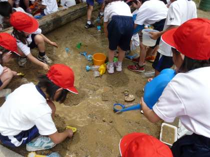 持ってきたもらったスコップやカップなどを使って,大きな砂山やどろケーキをつくったり,溝を掘り,水を流して,川や池を作ったり楽しく活動しました。
