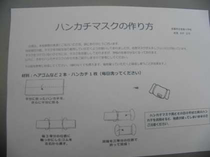 ゴムとハンカチで簡単にできるマスクです。端を少し縫うととれにくいですよ。