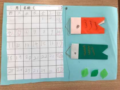 みなさん,5月(がつ)と言(い)えば?「こいのぼり」「かぶと」「母(はは)の日(ひ)」などがありますね。5組(くみ)では毎月(まいつき)カレンダー作(づく)りをしています。今月(こんげつ)のカレンダーをまた作(つく)ろうと思(おも)います。どんな作品(さくひん)や絵(え)にするか,考(かんが)えておいてくださいね。折(お)り紙(がみ)の本(ほん)や,インターネットを使(つか)って調(しら)べるのもいいですよ!週末(しゅうまつ)の課題(かだい)に入(い)れておきますね。