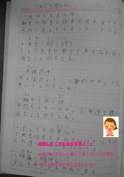 封筒の中に自主学習を提出してくれた友達がいたので紹介します。自主学習は自分で考えて取り組まなくてはいけないので,悩んでいる人もいるかと思います。学習課題には5年生の予習も多く入っているので,漢字など同じことをノートに復習するだけでも学習になります。参考にしてみてください。