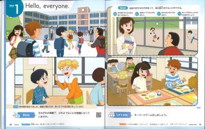 登場人物たちが,あいさつや自己紹介をしています。何て話しているか聞き取れるかな?自分の名前や好きなものを言って自己紹介をしていますよ。