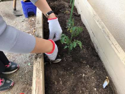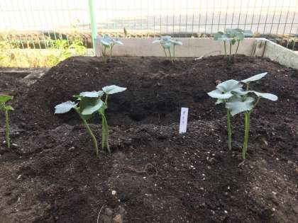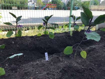 今年(ことし)の夏((なつ)は『オクラ』『なす』『プチトマト』そして『ポップコーン』を植(う)えました。みんなで植(う)えることができず残念(ざんねん)でしたが,夏(なつ)には一緒(いっしょ)に収穫(しゅうかく)できることを楽(たの)しみにしましょう!なすにはもう,かわいい紫色(むらさきいろ)の花(はな)が咲(さ)いていますよ。