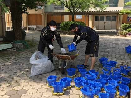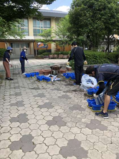 きのうは ミニトマトを うえるために、 みんなの うえきばちの おそうじを しました。
