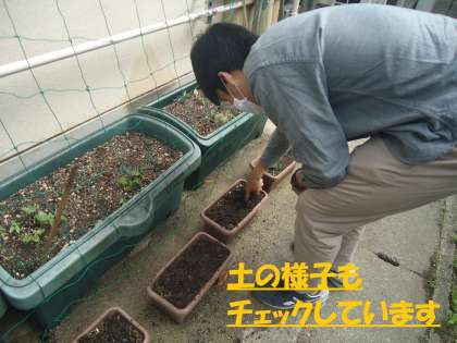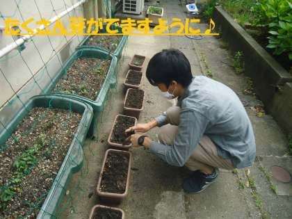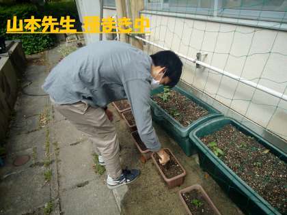 5年生のプランターを見ていると,インゲンマメの芽が出ている場所と,何もないところとがあったので,もう少し種まきをしてみました。