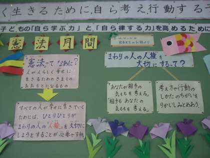 学校の大鏡前の掲示板も,5月の憲法月間に合わせてきれいに飾られています。学習相談日など学校に来た時にはまた見てみてください。