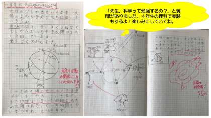 日本には四季があります。なぜ,春・夏・秋・冬と順番が変わるのか?という疑問を調べてまとめていました。説明するのは少しむずかしいけれど,絵や図をかいてみると分かりやすいですね!科学者を目指してがんばって勉強を続けるそうです。夢をもって取り組めるのもすてきですね☆!Very good!!