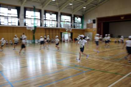 新聞紙を体にくっつけて,落とさないように走ります。誰が最後まで落とさずに走りきるのかが勝負です。くっつける新聞紙も,自分で大きさを決めます。大きい方がいいのか,小さい方がいいのか,それも作戦です。