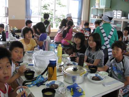 調理が終わった後は,いよいよ作ったものを食べます。子どもたちは,旬の野菜を使ったメニューを,一口一口味わいながら食べていました。ずいきに苦手意識をもっている子どももいましたが,「食べてみるとおいしい!」と喜んでいる姿が見られました。また,枝豆ご飯が好評で,たくさんおかわりしていました。