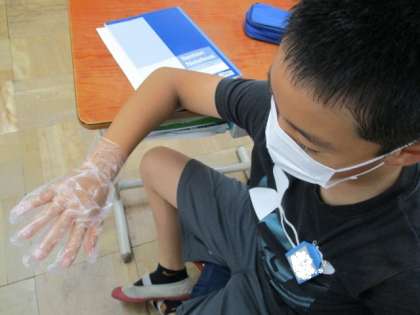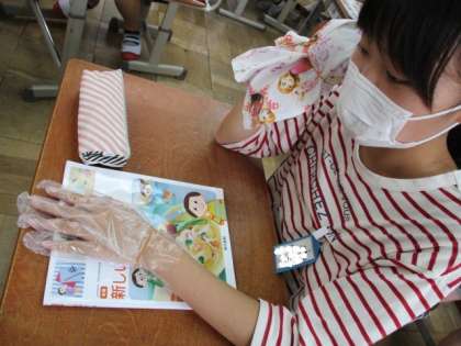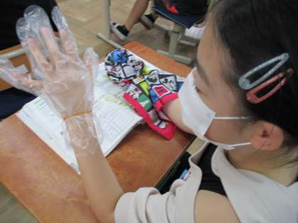 家庭科の学習では,夏をすずしく過ごすために,どんな工夫があるのか学習しました。湿気の通しやすさを比べる実験では,ポリ袋の方は「すぐに汗ばんできた。」や「なんか袋がくもってきたよ。」など,ポリ袋と布の吸湿性を感じました。今年の夏は,風を感じる服を選んでみてはいかがでしょうか。