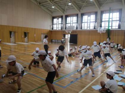 4年生が立ち幅跳びや反復横とびを実施し