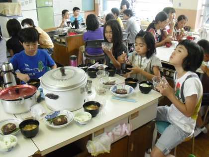 本日2回目の出前板さん授業がありました。中央卸売市場の方からお話を聞き,調理実習をしました。調理実習では新鮮な京野菜を使い,トマトとナスの和風スープやずいきのごまずあえ,枝豆ごはん,賀茂なすの肉味噌田楽を作りました。調理実習では,京都食べもの文化研究会の方々に調理方法をおそわりながら,作ることが出来ました。貴重な体験ができましたね。