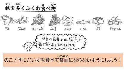 大豆には,貧血を防ぐ鉄が多く含まれています。体が成長している小学生は,鉄が不足しやすいといわれています。大豆製品や肉の赤身,魚の血合い,貝などの内臓まで食べられる食品にも多く含まれています。