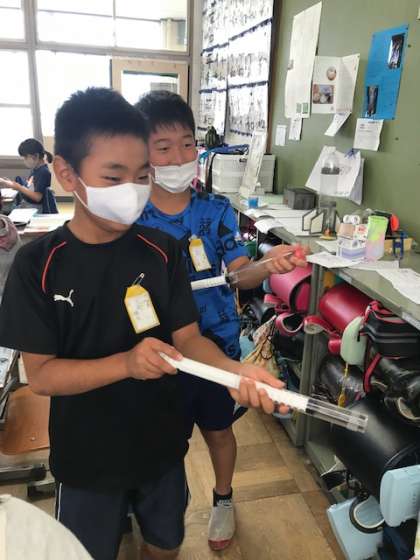 今週から新しい単元「とじこめた空気と水」に入っています。とじこめた空気に力を加えると,空気の体積や手ごたえがどうなるのか,予想をして調べていきました。空気をとじこめて力を加えると,空気の体積は小さくなることや,空気は体積が小さくなると,手ごたえが大きくなることに気付くことができました。実験はとても楽しそうでした。