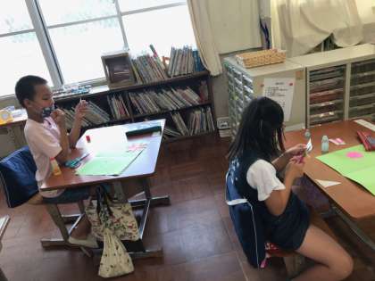 10月になり,教室に掲示するカレンダーを作りました。今月は色紙を使って『コスモス』を作りました。色紙を細く切る・縦横ななめに貼り重ねる・丸い紙を切る・クーピーで茎や葉を描くという流れを確認し,みんなとても真剣に取り組みました。同じ題材でも一人ひとりの作品の表情は違うので,とてもきれいな仕上がりになりました。