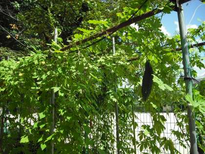 真夏の陽ざしをいっぱいに受けて,ツルレイシが大きく育ち,美しい花を咲かせています。夏の暑さに負けず,ぐんぐん生長する生命力は流石です。