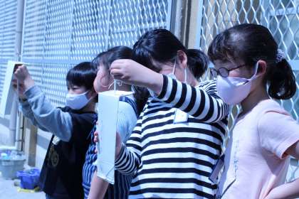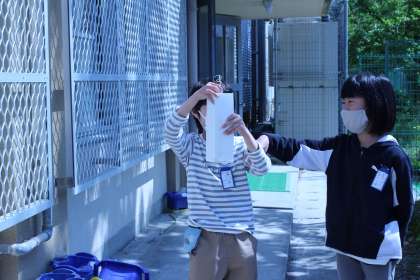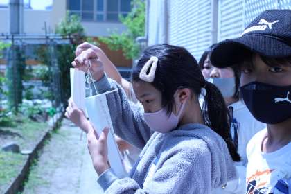 晴れの日の気温の変化を調べました。1時間ごとに同じ場所で気温を測定します。9時頃は25度前後だった気温が,正午過ぎには31度に!ちなみに,その日の天気予報の最高気温は26度でした。「天気予報より暑いって・・・。」「31度って真夏やん・・・。」と不思議そうにつぶやく子もいました。水分補給と帽子の大切さがよくわかる一日でした。