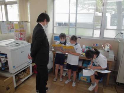 新入生に学校の各教室を紹介するポスターをつくります。それぞれの教室の担当の先生に,クラスの人数や何に使う部屋かなどをインタビューしました。