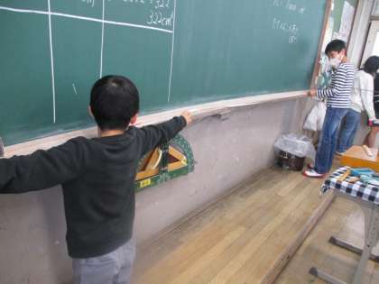 また,5年生が9人くらい入る1㎥の大きさにみんな驚いていました。「この大きさが100個以上入る教室はやっぱり大きいな。」など,実際の大きさを見て,1㎥を実感しました。