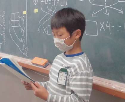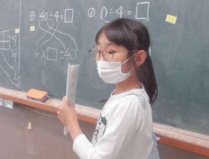 今日は,答えが九九にないわり算の答えの求め方を,みんなで考えました。自力解決の時間には,絵や図や式を使ってとこうと,一生懸命に考え,自分の考えをたくさん書いていました。集団解決の時間では,「どうやったら,みんなに分かりやすく伝えられるかな?」と考えながら,発表をがんばりました。自分だけでなく,みんなが分かるとうれしいですね!最後の問題,全員はなまる!