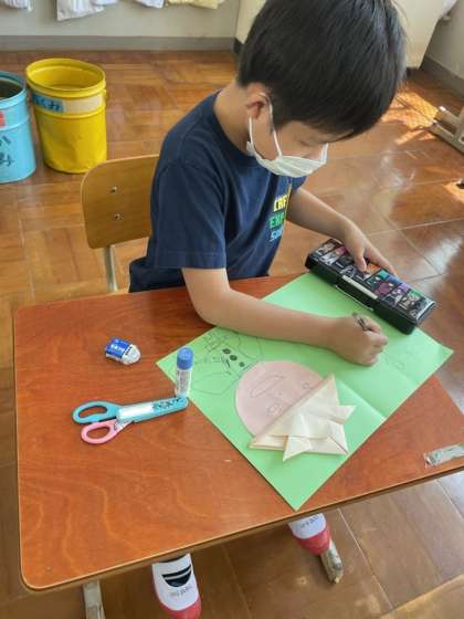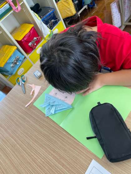 毎月のカレンダー作り。今日は少し遅くなってしまいましたが,5月のカレンダーを制作しました。今回は折り紙で『兜(かぶと)』を作り,自分の顔にかぶせてみました。久しぶりの折り紙でしたが,先生の説明を聞いたりお手本を見たりしながらみんな上手に折り進めていきました。完成したカレンダーはとてもかわいく,さっそく教室に掲示しました。