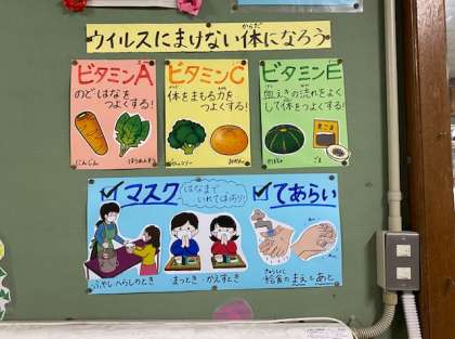 大鏡前の掲示のテーマは,『ウイルスにまけない体になろう』です。桂東小学校のみなさんは,給食前の手洗いや給食中に話さないことなど,コロナ禍のルールをとてもがんばって守っています。もう一度,マスクや手洗いを忘れないように気を付けて,みんなで健康にすごしていきましょう。